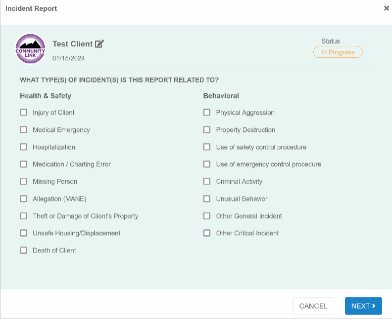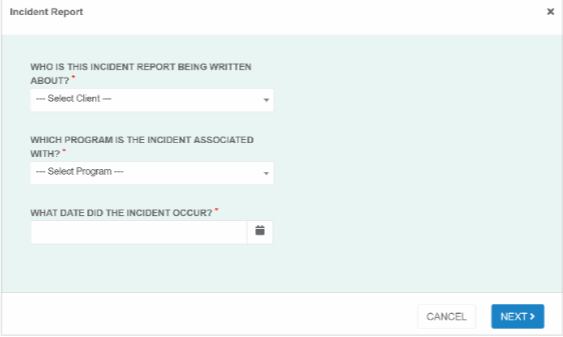 It will then prompt you to select the client you are writing the report for, which program, and the date. After entering this information click “Next.”