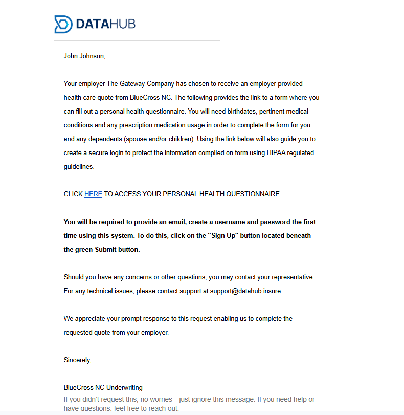 Once the MHQ invitation is sent, the member will receive an email that includes a secure link to access the MHQ form.