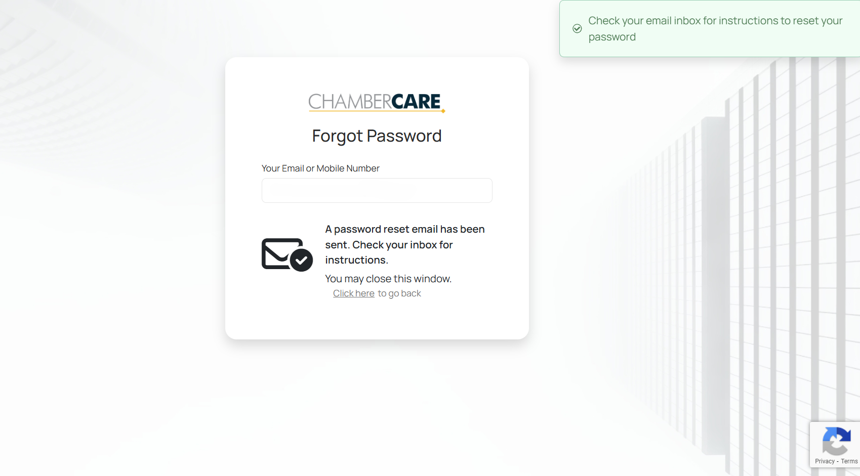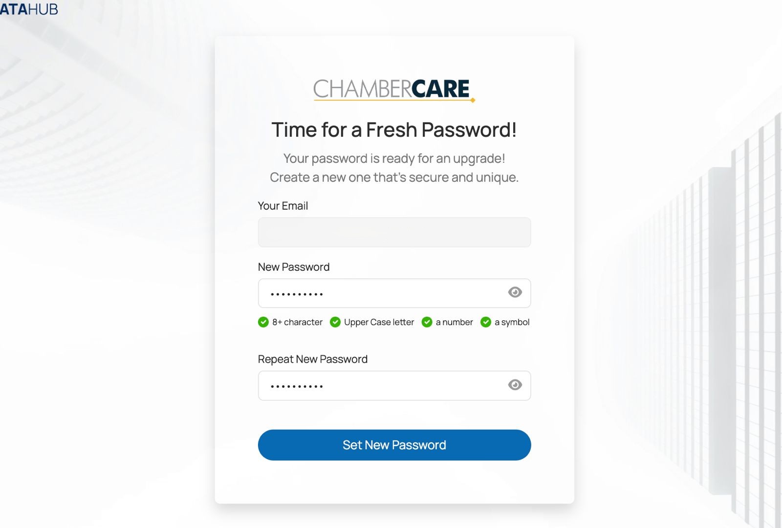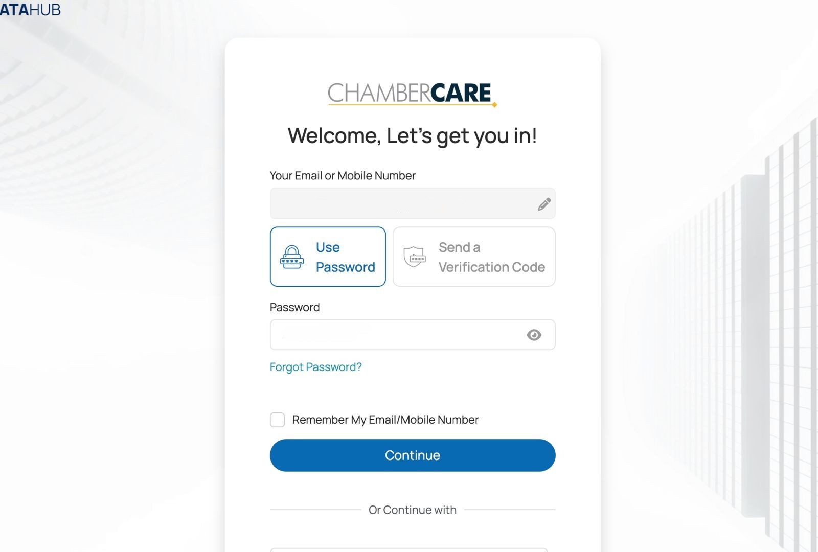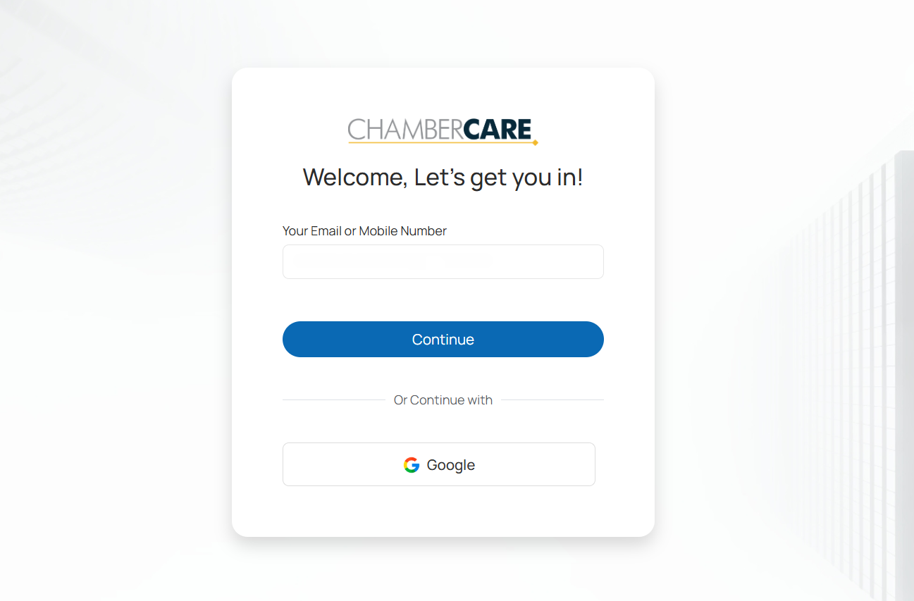 Go to the website address: chambercare.datahub.insure/login. Then, enter your Email Address in the field provided.