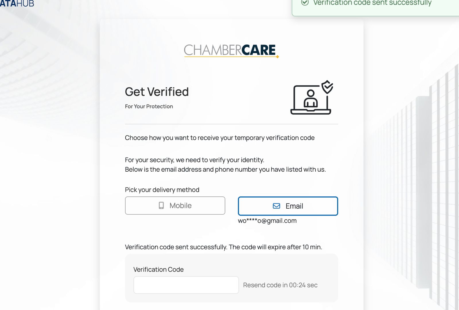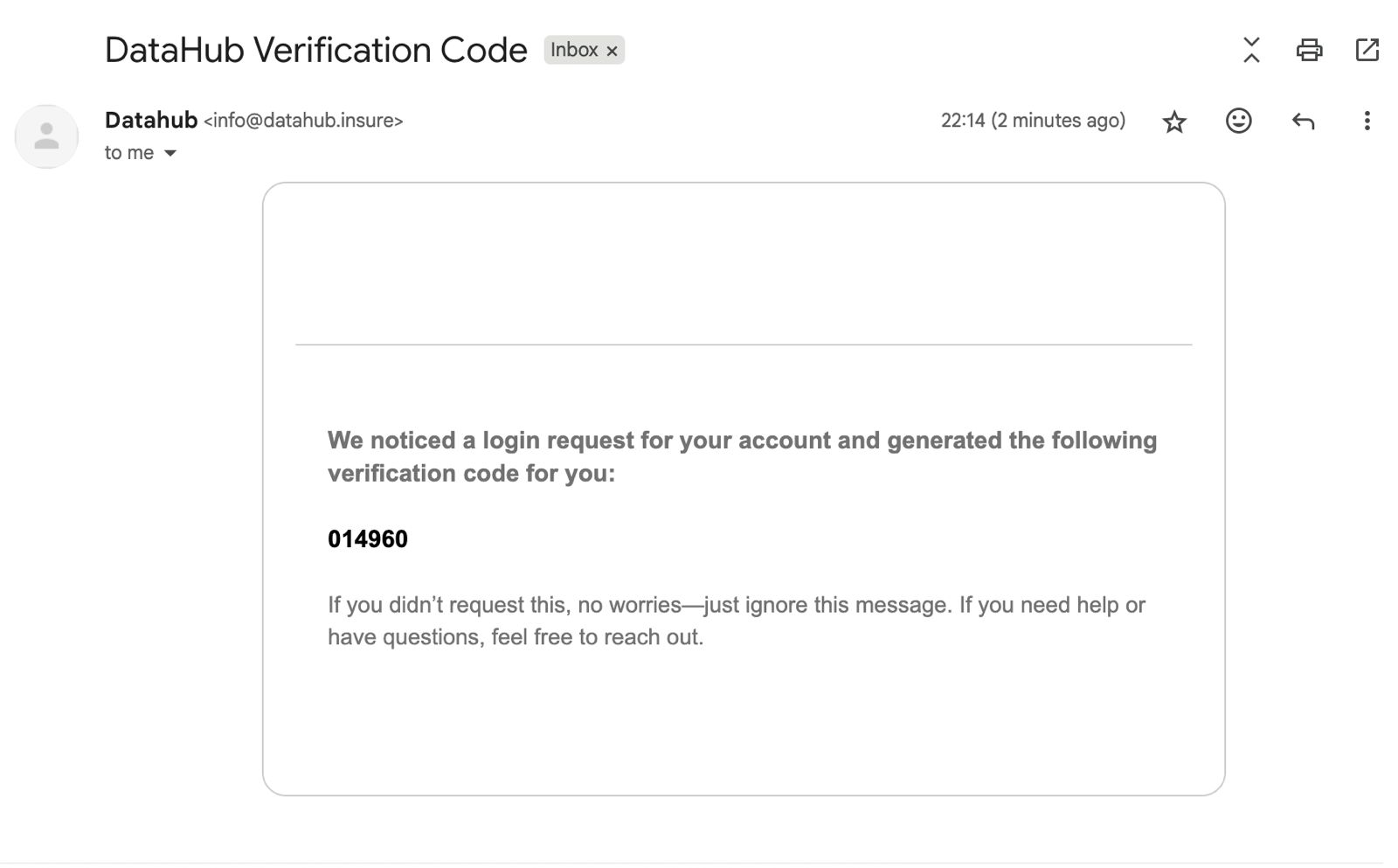 Check your email inbox. Note the 6-digit verification code and input it on the login verification screen in DataHub.(Also, check your spamfolder if the code doesn't appear in your main inbox right away.)