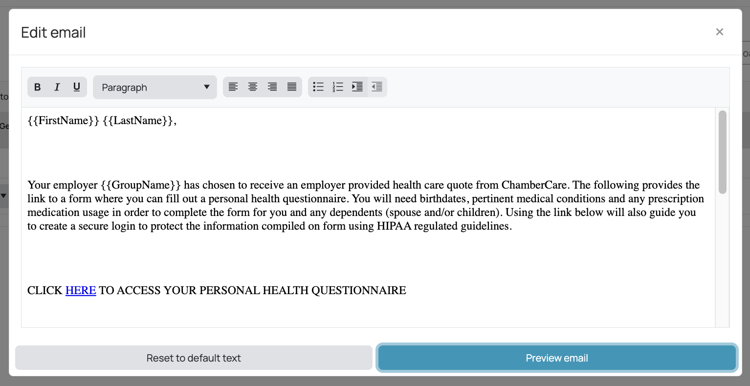 You will be redirected to a pop up where a template is ready - this can be edited before it can be sent. Once clicking the “Send Email” button, you will also be able to see a Preview before it sends.