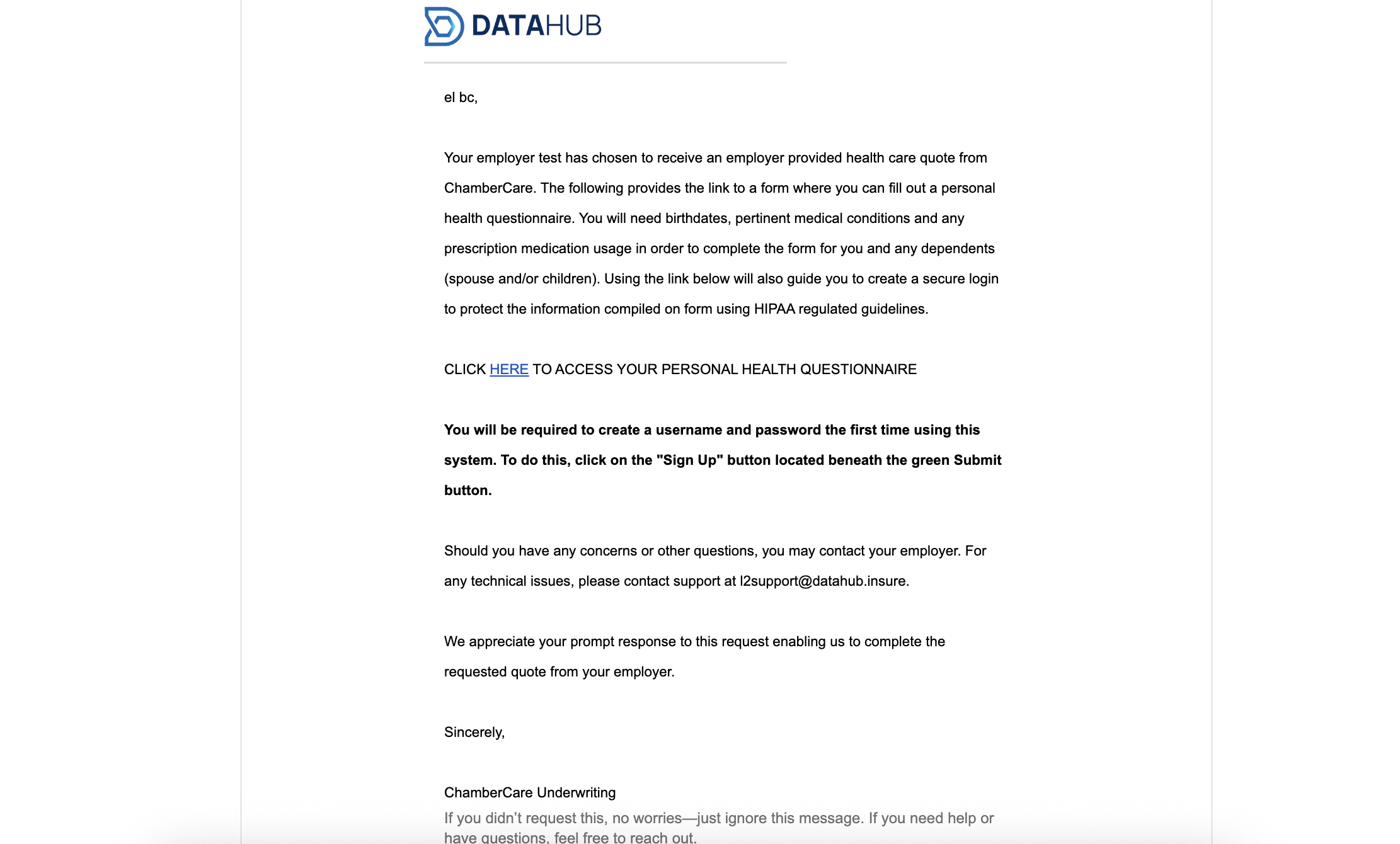PHQ invitations are sent from chambercare@datahub.insure. Members will then receive an email with a link to begin their PHQ - that looks like the one below: